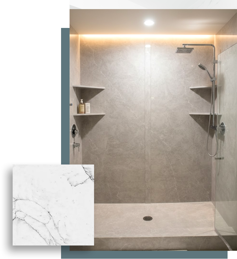 Here at CMS, we provide custom, hard surface, marble material to enhance all wet areas of any bathroom. The material is poured with precision by our experienced team of fabricators. We stand behind our thorough team of installers who work hard to provide a 5 star, finished product that you will enjoy for many years. We work with our customers to meet their design needs as well as any specific scheduling needs they may have for installation. We put great focus on providing shorter lead times so our customers can avoid being without a working bathroom area for longer periods of time.
